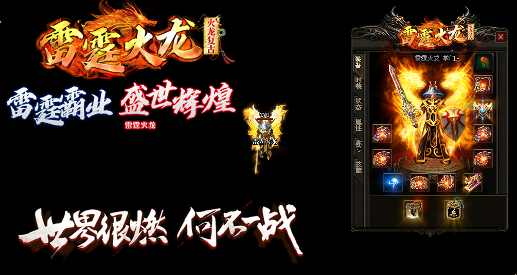 【装备介绍】:雷霆、战神、火龙、火龙杀神、火龙至尊、火龙逆天,所有装备全部靠爆,无合成,玩法新颖,独家巨作